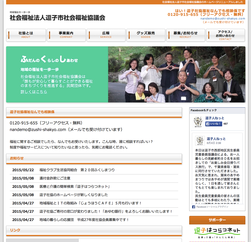 株式会社コスタルプランニングは、神奈川県逗子市社会福祉協議会のホームページリニューアルプロジェクトに参加し、主にユーザビリティ設計とデザイン、コーディング、サーバー移管作業のお手伝いをしました。